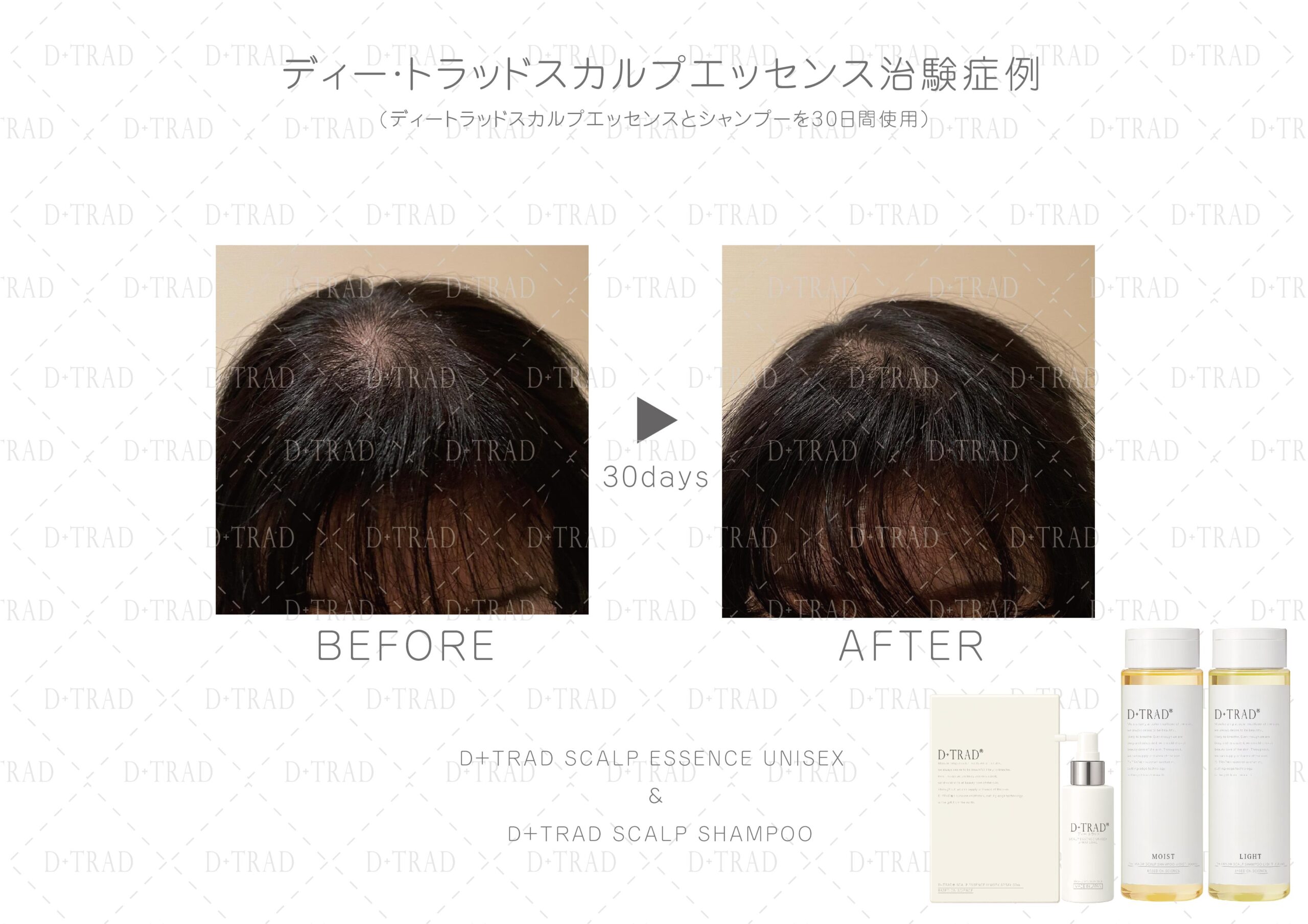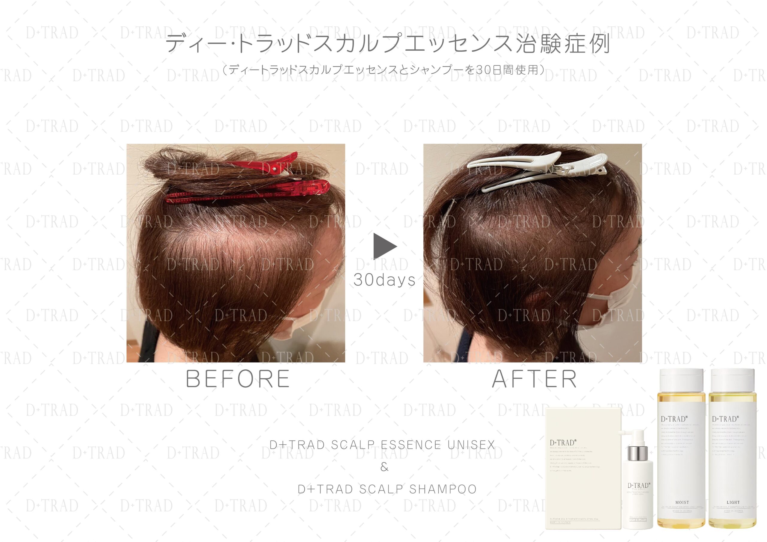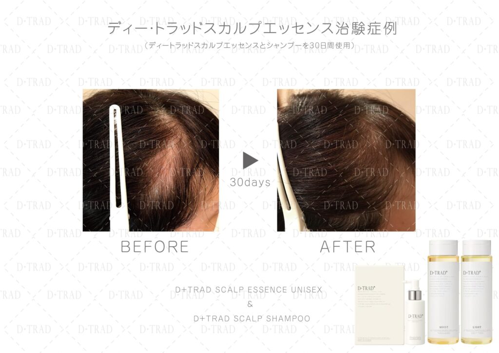 薄毛・抜け毛が気になる30代、40代、50代、60代、以上の女性の方に、ディー・トラッドスカルプエッセンスとディー・トラッドスカルプシャンプーを30日以上ご利用頂いた治験を行いました。