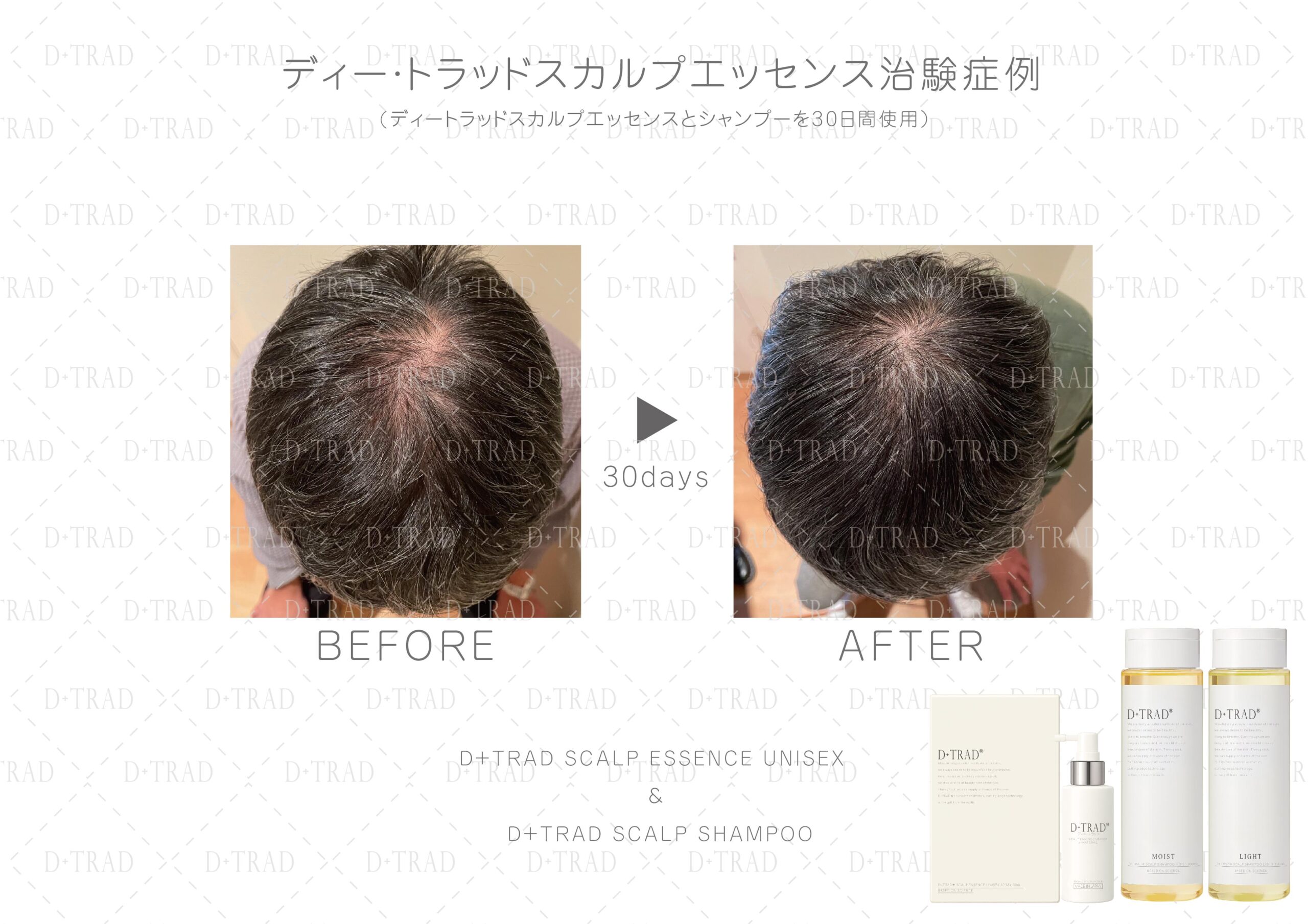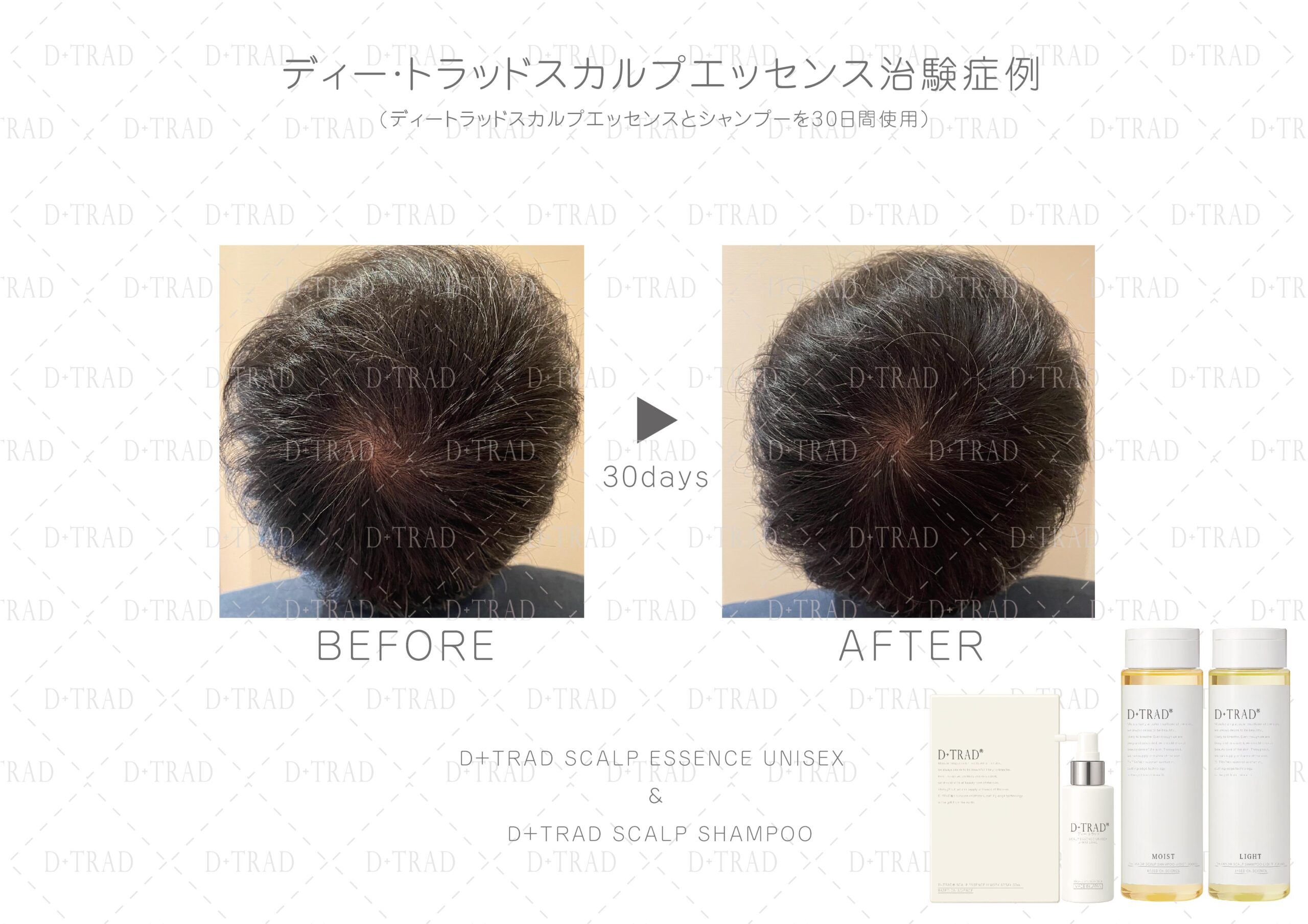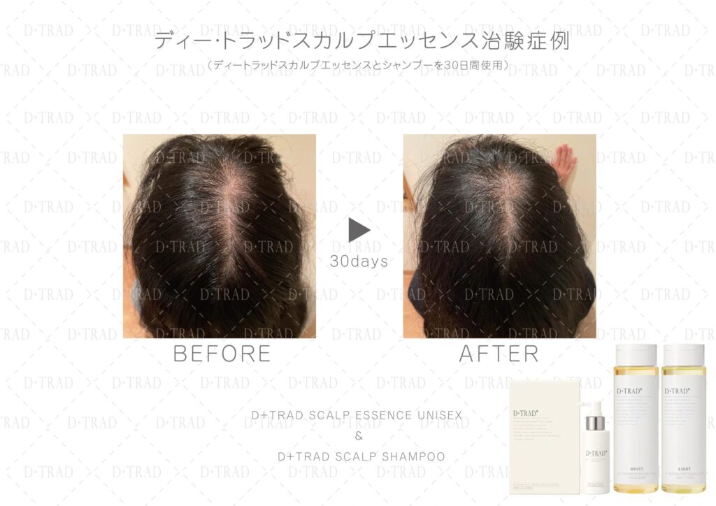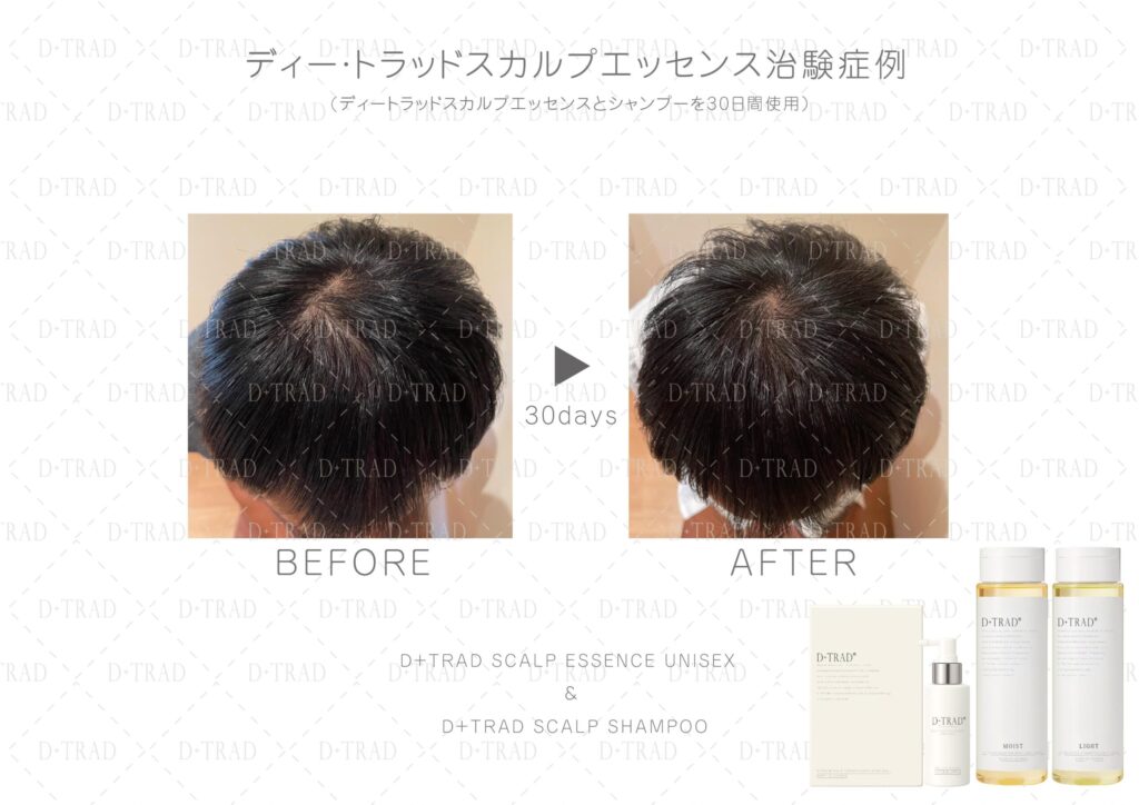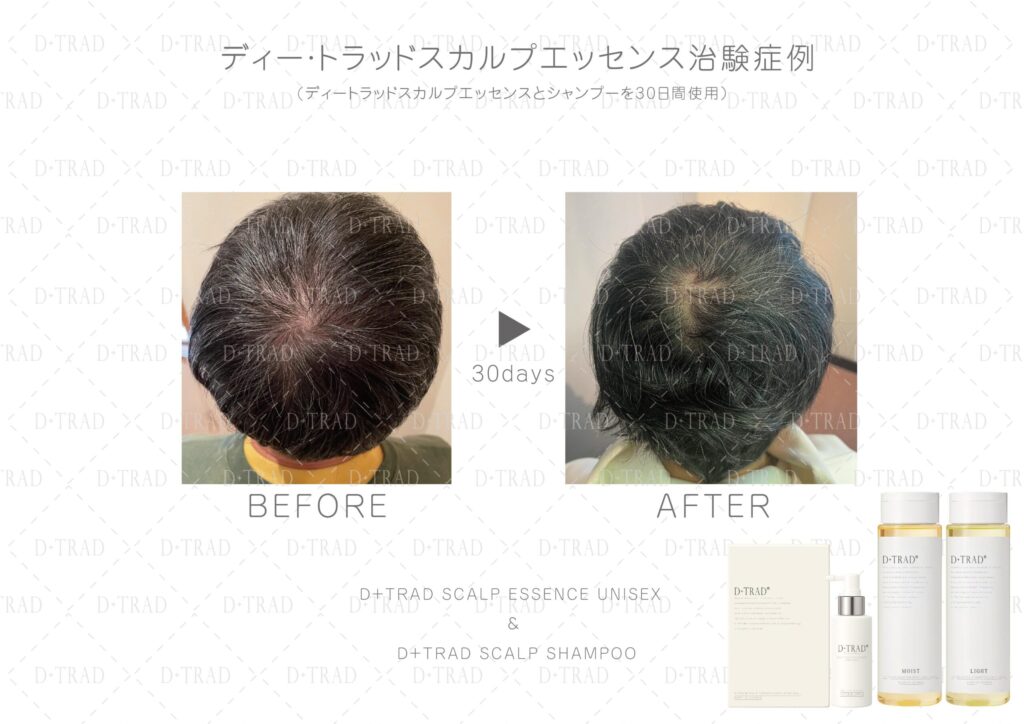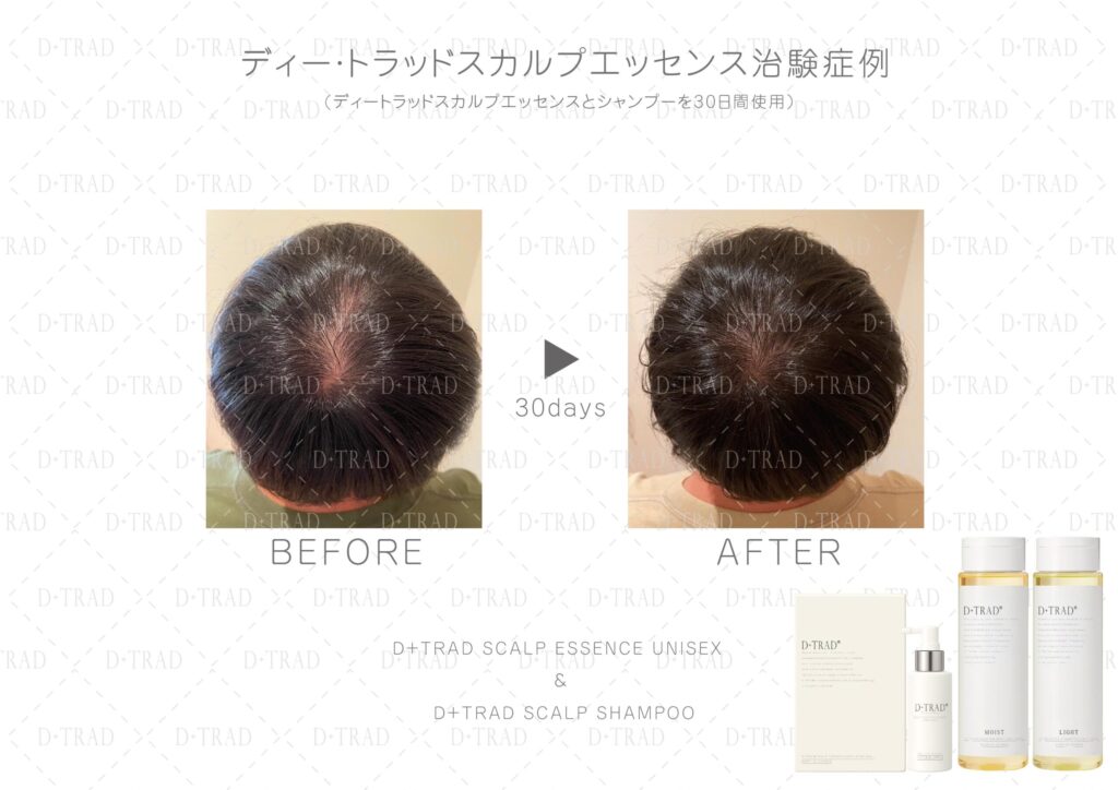 薄毛・抜け毛が気になる30代、40代、50代、60代、以上の男性の方に、ディー・トラッドスカルプエッセンスとディー・トラッドスカルプシャンプーを30日以上ご利用頂いた治験を行いました。