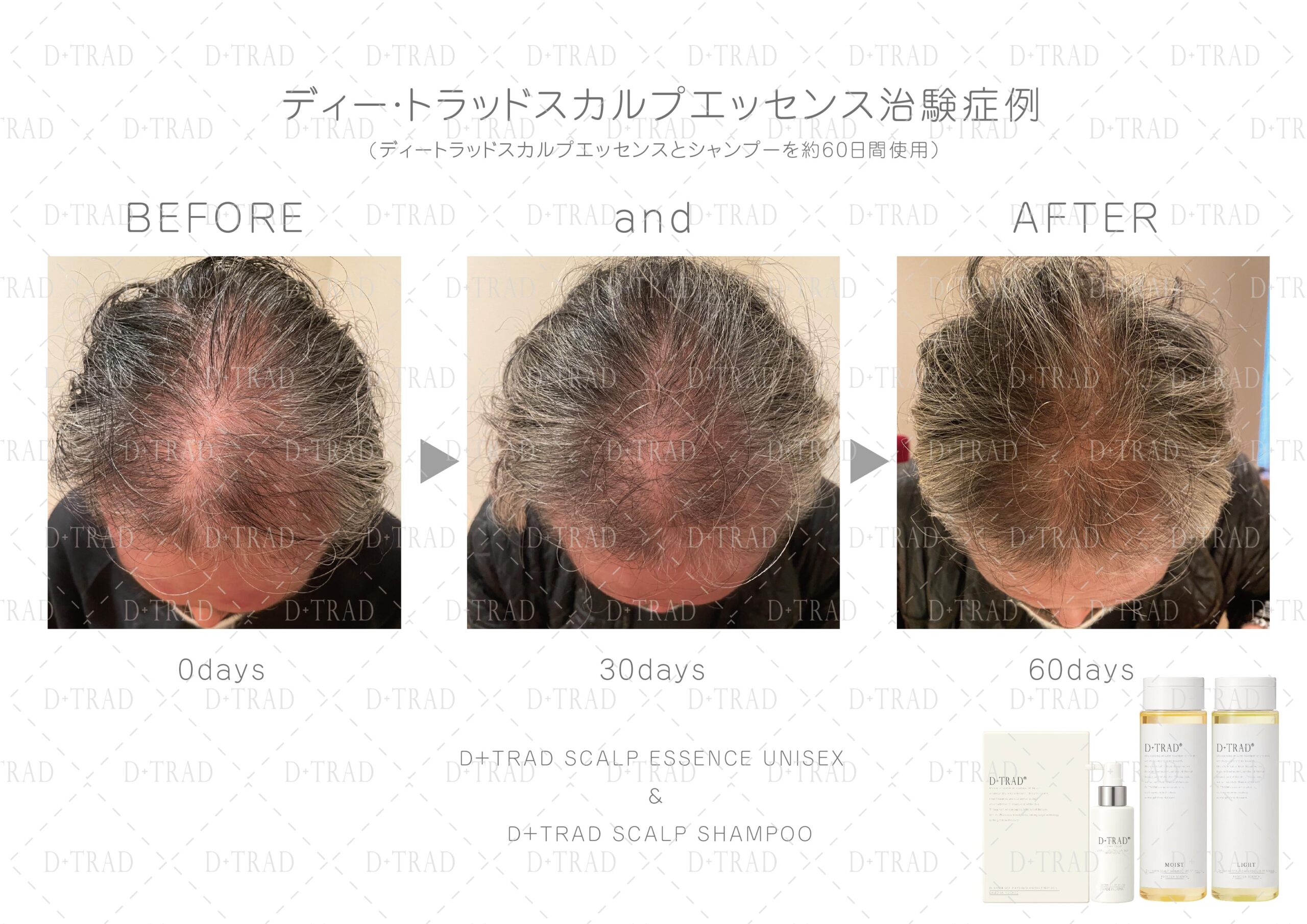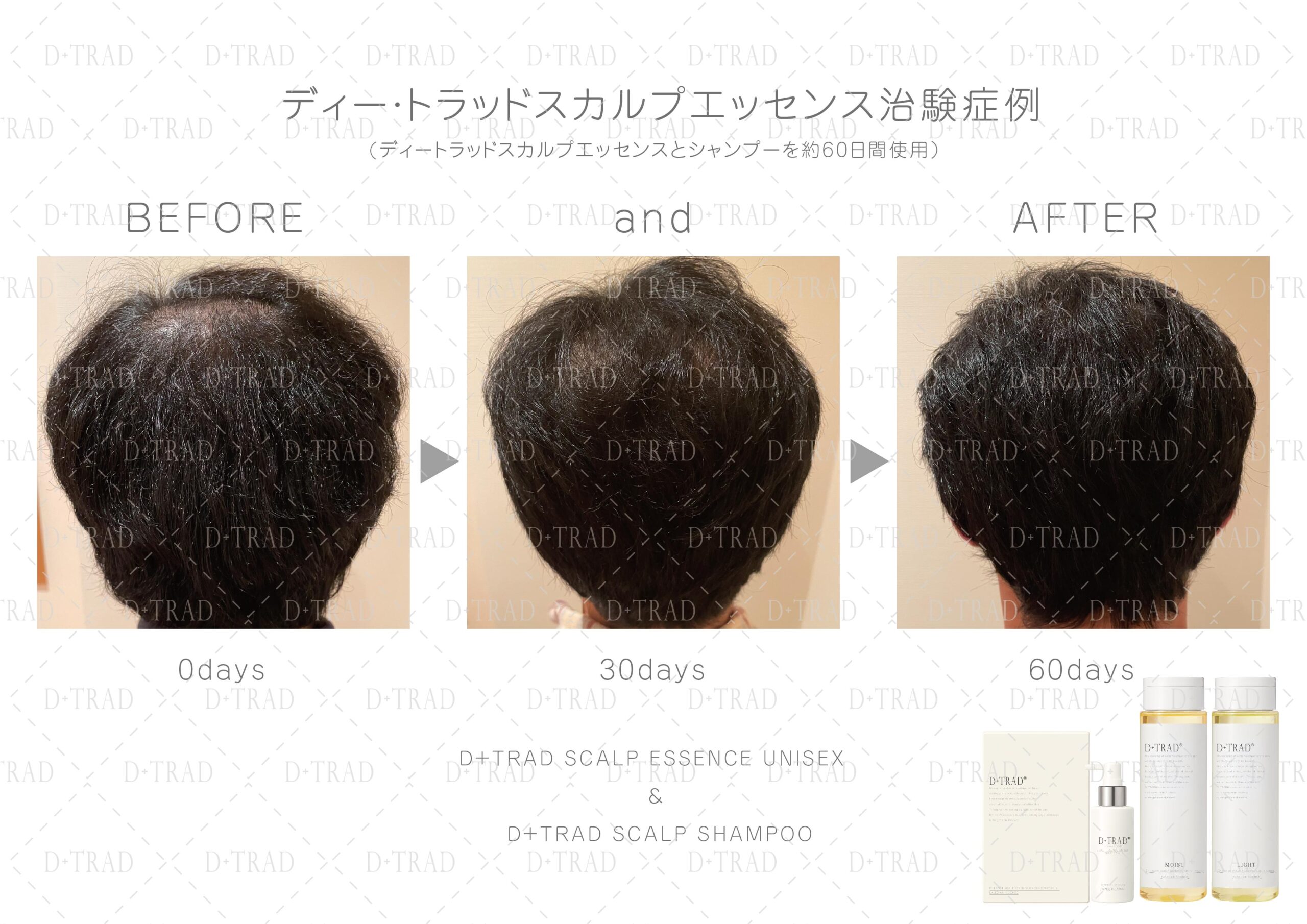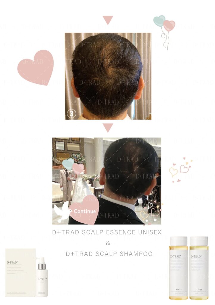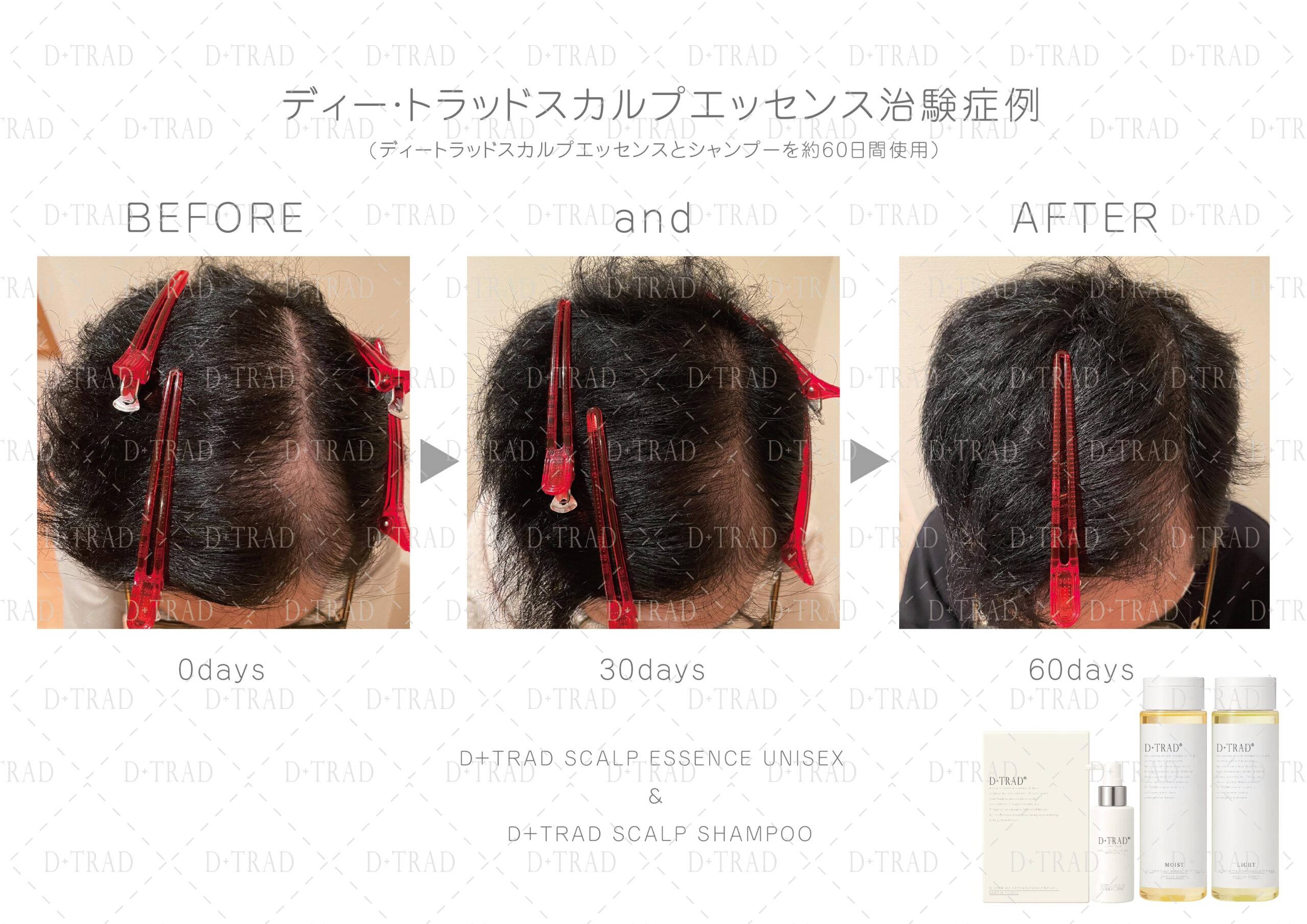 薄毛・抜け毛が気になる30代、40代、50代、60代、以上の男性の方に、ディー・トラッドスカルプエッセンスとディー・トラッドスカルプシャンプーを30日以上ご利用頂いた治験を行いました。